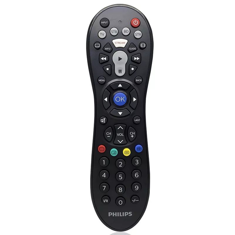 Telecomanda universala 4 in 1 PHILIPS. O telecomandă ergonom. 4 în 1, care se potriv. perfect în mâna ta. Functioneaza perfect cu dispozitiv. cu redare în flux, precum Apple TV şi Roku Butoanele mari ale telecomenzii facilitează citirea etichetei. În plus, apăsarea butoanelor devine mai confortabilă, deoarece dimensiunea a crescut cu 2 mm faţă de cea pentru butonul standard. Asistenţă tehnică dedicată pentru telecomanda dumneavoastră prin intermediul căreia codurile pentru toate mărcile sunt disponibile pe site-ul Web Philips URC. Specificaţii tehnice Confort - Număr de taste: 46 - Reglementări şi standarde: marcaj CE - Dispozitive acceptate: televizor, DTV, cablu, SAT, player Blu-Ray, DVD, DVR, dispozitiv de redare în flux Funcţie infraroşu - Interval frecvenţă de transmitere: 24 - 55 kHz - Numărul de mărci din baza de date: peste 1000 - Distanţă de operare: 10 m - Unghi transmisie: 45 grade - LED-uri de transmisie: 1 - Bază de date universală de coduri IR: da Alimentare: 2 baterii AAA (nu sunt incluse).