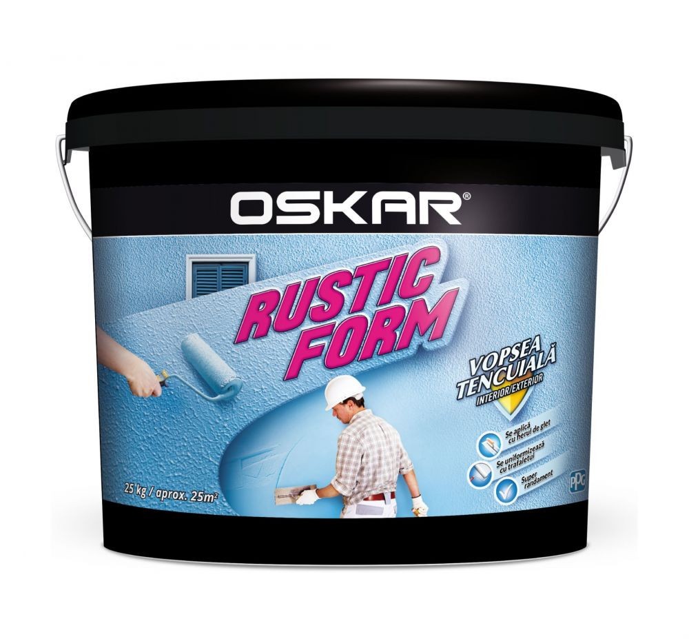 Oskar Rustic Form este o tencuiala decorativa, dura, cu aspect mat, structurat, recomandata pentru finisaje interioare si exterioare. Aceasta are la baza rasina sintetica in dispersie apoasa, aditivata cu latex siliconat si agregate minerale si poate fi aplicata pe orice suprafata de baza minerala precum: tencuieli uzuale de var-ciment, ciment-var, gleturi de ipsos, beton, placi de gips - carton si pe vopsitorii vechi, rezistente la frecare si uzura. Caracteristici principale: aderenta deosebita la suport, buna putere de acoperire; timp bun de uscare; pelicula este permeabila la vapori de apa si impermeabila la apa; rezistenta la zgariere, socuri mecanice, solutii alcaline, variatii de temperatura, intemperii si la gaze industriale. Produsul se aplica nediluat sau diluat cu maxim 2% apa, astfel: in grosime uniforma, direct cu trafaletul (rola) de blana ca vopsea structurata sau in grosime uniforma, cu fierul de glet din otel inoxidabil, cu structurare prin roluire cu un trafalet rola de burete (se obtine o tencuiala cu aspect de calciu) sau cu structurare utilizand diverse unelte precum: mistrie, fier de glet, rola de presat tapet (se obtine o tencuiala decorativa sau cu aspect rustic). Pentru a preveni aparitia nadelor si a depunerilor, tencuiala se va aplica intr-o singura etapa in procedeul ,,umed pe umed” (fara intrerupere). Consumul specific mediu este de 0.8 - 1.8 kg / mp, in functie de natura suportului si structura dorita. Valoarea exacta a consumului specific se va determina in urma unei probe efectuate la fata locului. Tencuiala Oskar Rustic Form este ambalata in recipient din plastic de 25 kilograme.