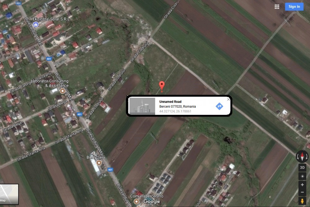 Teren intravilan de vanzare la intrare in comuna Berceni, 825 mp total. Deschidere 33m x 25m. Pretabil pentru duplex. Intrare din strada Codrului. In spatele Carrefour Market. Pentru detalii lasati mesaj. Locatie GPS googlemaps: 44.327124, 26.178861 In timpul saptamanii nu sunt disponibil intre 9:00 - 17:00. Am rugamintea sa lasati mesaj/sms