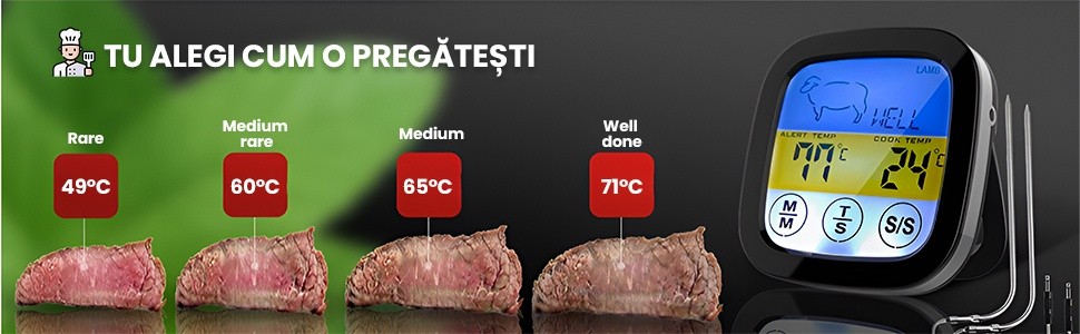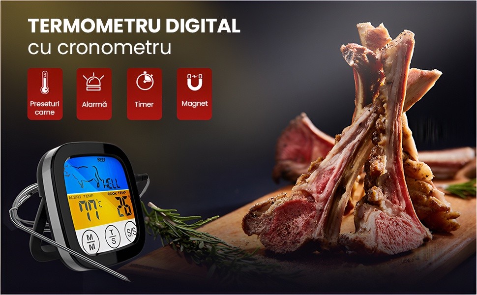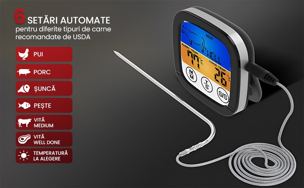Acest termometru digital de bucatarie cu display tactil LCD si 8 preseturi automate pentru diferite tipuri de carne reprezinta o solutie pentru gatitul de precizie. Cu 5 moduri de pregatire conform standardelor USDA, cronometru programabil si sonda din otel inoxidabil cu cablu de 1 metru, acest instrument asigura preparate gatite optim de fiecare data.