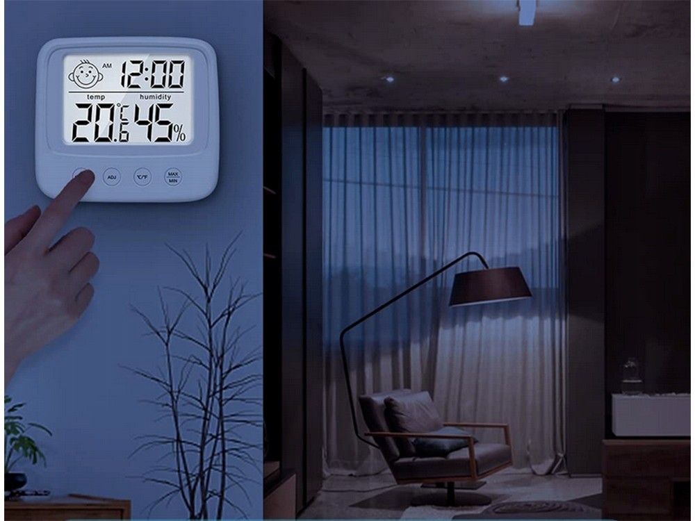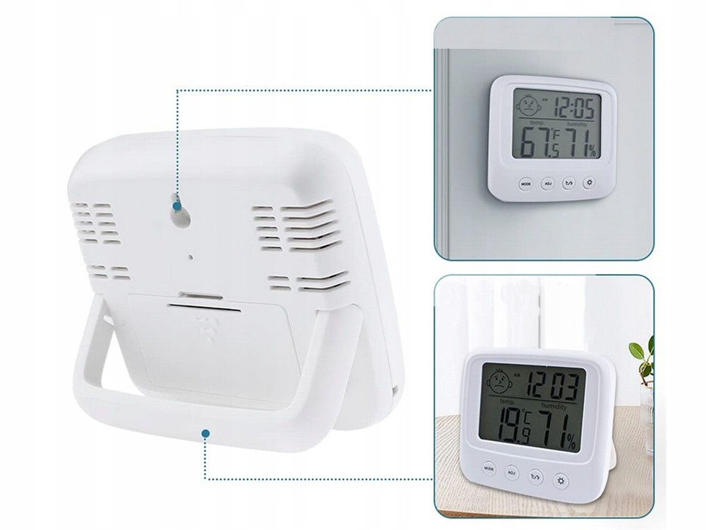 Un termometru modern cu higrometru, se va potrivi perfect in spatiul oricarei camere Poate fi plasat oriunde: pe un dulap, pervaz sau masa, sau agatat pe perete Dispozitivul va fi util in multe case, deoarece este extrem de functional.