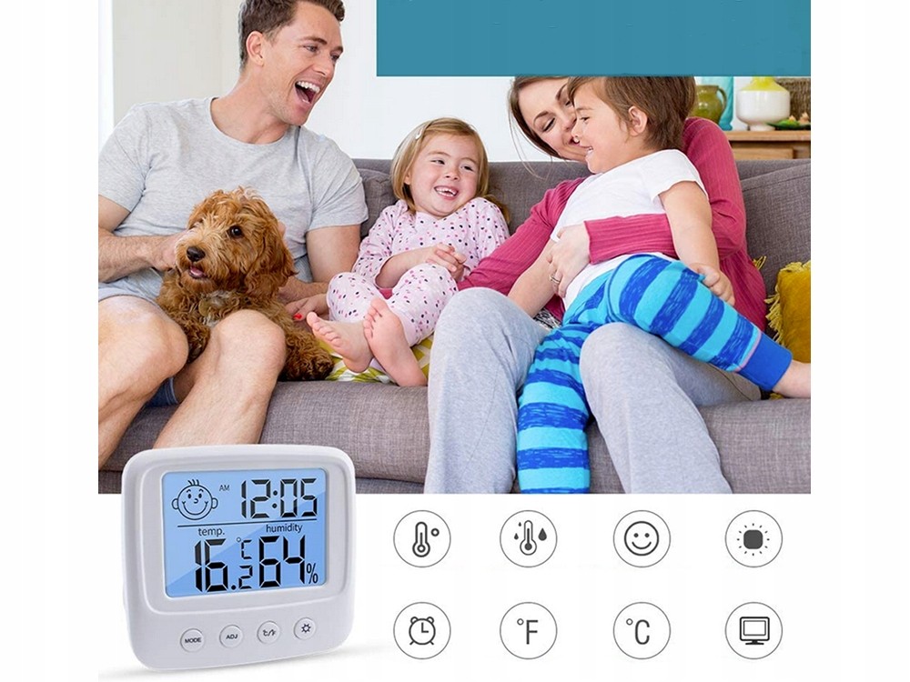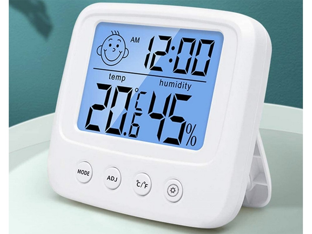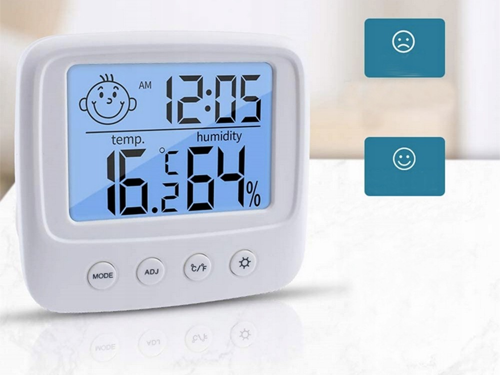 ✅ Indicator de confort al desenului: o fata zambitoare indica "confort" (umiditate relativa: 40%-70%) si o fata trista indica "disconfort" (umiditate relativa: <40% sau> 70%).