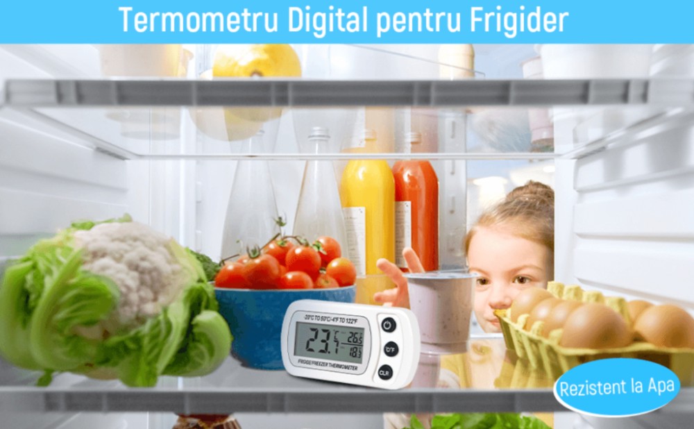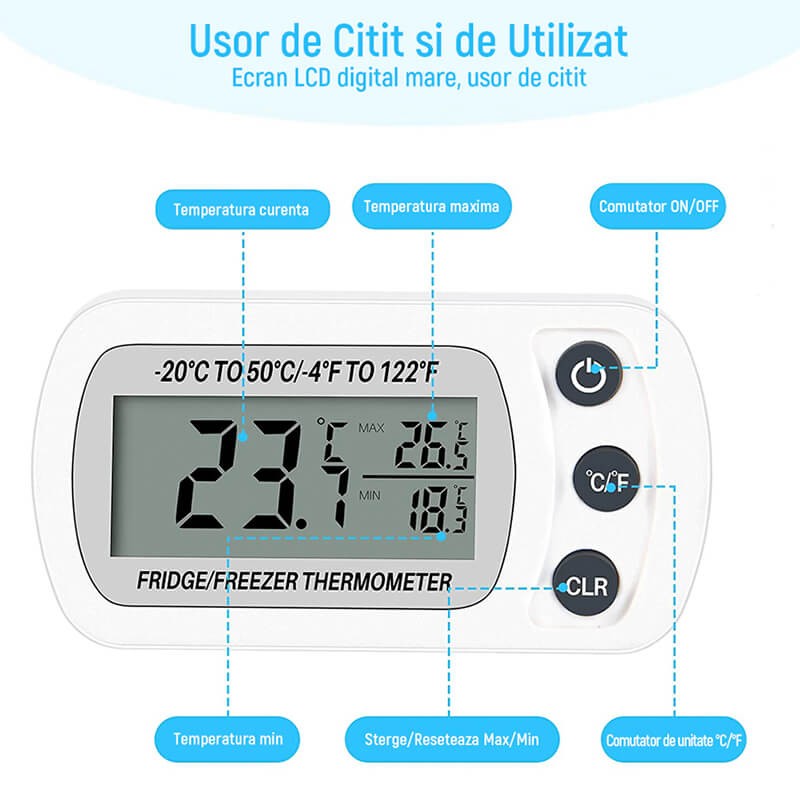 Fabricat din materiale durabile si rezistente la umiditate, acest termometru este rezistent la apa, fiind ideal pentru utilizare in medii reci sau cu condens. Designul alb, minimalist, se integreaza perfect in orice tip de frigider sau congelator, adaugand un plus de functionalitate si control.