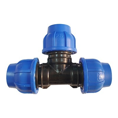 Teul de compresiune este o piesă din plastic dur care face legatura între trei țevi de polietilenă cu dimensiunea de 25 mm, PN 16.