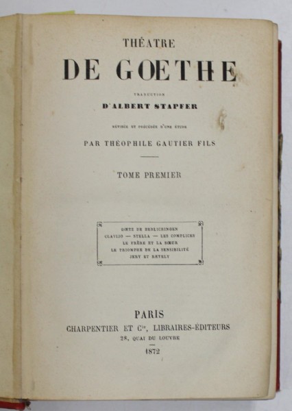 THEATRE DE GOETHE , DEUX VOLUMES , 1872