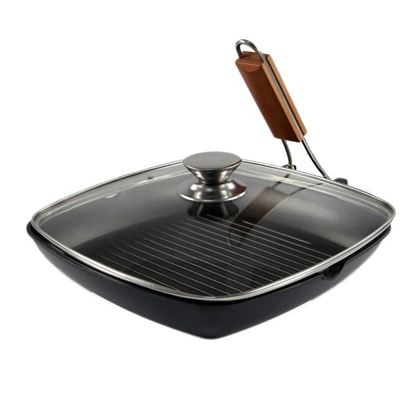 Tigaie aluminiu tip grill, 20 x 20 cm, strat teflon, pereti grosi, maner pliabil, capac inclus