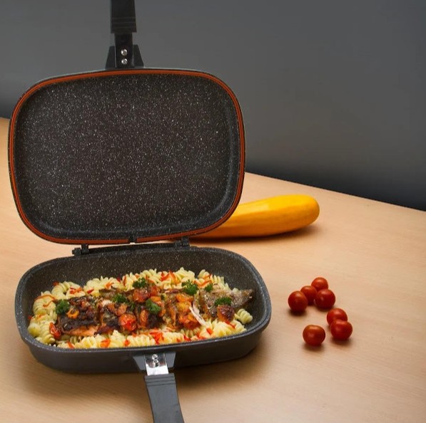 Tigaie dubla grill, interior antiaderent, manere din bachelita, confectionata din aluminiu, negru