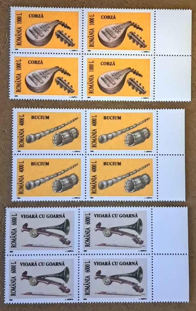 TIMBRE ROMANIA MNH LP1619/2003 -INSTRUMENTE MUZICALE -uzuale- BL. de 4 timbre