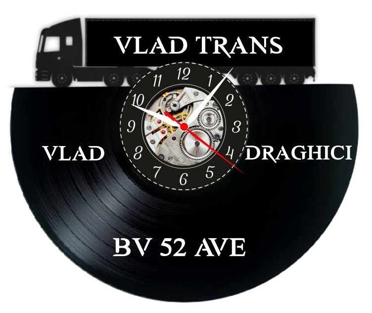 https://www.ceasul-bun.ro/wp-content/uploads/2025/07/ceasul-bun-2.mp4Descoperă eleganța și originalitatea unui ceas de perete lucrat manual din disc de vinil autentic! Fiecare ceas este o piesă unică, transformând un disc clasic într-un obiect decorativ funcțional pentru casa sau biroul tău.Caracteristici distinctive:Design inspirat din industria transporturilor, cu silueta unui camion în partea superioarăMecanism de ceasornic expus în centru, oferind un aspect steampunk sofisticatComplet personalizabil cu numele companiei tale sau nume personalPosibilitatea adăugării numărului de înmatriculare preferatCifre clare, ușor de citit, cu ace roșii contrastanteExemplul din imagine prezintă un ceas personalizat cu inscripția "VLAD TRANS", numele "VLAD DRAGHICI" și numărul de înmatriculare "BV 52 AVE".Fabricat cu pasiune și atenție la detalii, acest ceas nu este doar un instrument de măsurare a timpului, ci și o operă de artă contemporană. Materialul durabil al discului de vinil asigură rezistență în timp, iar mecanismul de calitate garantează precizia măsurării timpului.Perfect ca element central în decorațiunile moderne, cadou corporativ personalizat sau amintire specială pentru cei care apreciază obiectele unice, realizate manual, cu personalitate.Fiecare ceas este fabricat individual, la comandă, conform specificațiilor tale.