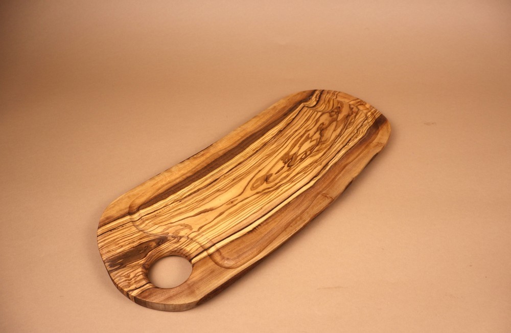 Tocator din Lemn de Măslin – Realizat Manual Un tocator sau un platou de servire elegant și funcțional pentru bucătăria si casa ta, realizat manual din lemn de măslin, cu atenție la detalii. Caracteristici: Antibacterian Natural: Lemnul de maslin nu retine mirosurile si nu se pateaza.Material Premium: Fabricat din lemn de măslin de cea mai bună calitate, fiecare tocător este unic, având un model distinct și o textură plăcută la atingere.Design Inteligent: Prevăzut cu un șanț special, tocătorul împiedică scurgerea sosurilor, menținându-ți suprafața de lucru curată.Loc pentru Sos: Include un loc dedicat pentru sosuri, astfel încât să ai totul la îndemână și să poți savura preparatele tale preferate fără griji. Îngrijire și întreținere:Pentru a-i păstra frumusețea și durabilitatea, se recomandă spălarea de mână cu apă caldă și săpun, evitându-se scufundarea în apă. Aplică din când în când ulei de măslin pentru a menține lemnul hidratat. Dimensiune (L x l): 55 x 19 cm