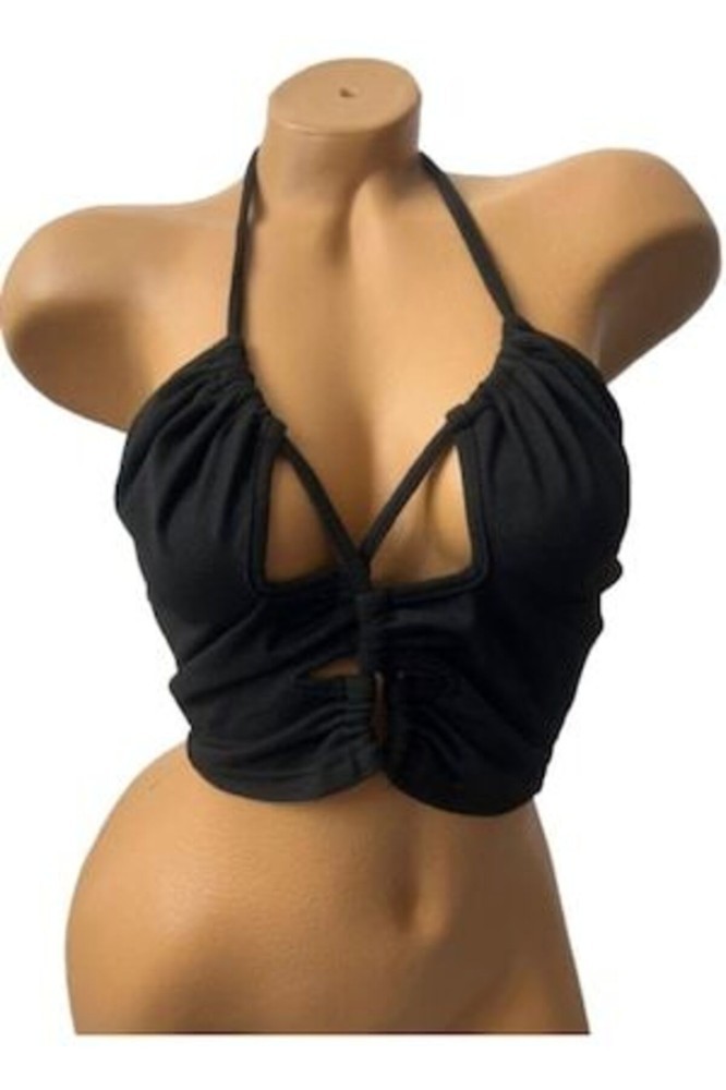 Șnurul reglabil permite strângerea cupelor, creând efectul dorit de decolteu. Șnurul se leagă în jurul gâtului, oferind un aspect uimitor de spate fără spate. Topul are o croială asimetrică și un decolteu adânc în V, cu efect de înfășurare.