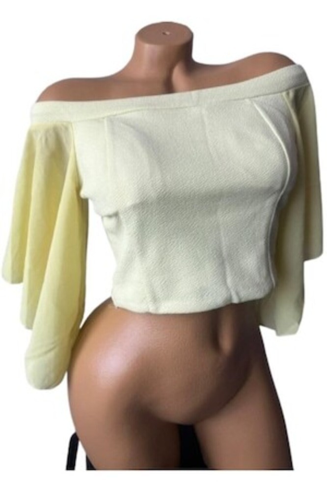 Top galben cu mâneci transparente tip clopot; Fabricat din poliester și elastan, cupe căptușite și croială cu umerii goi.; Promoție valabilă începând cu 11-07-2025, în limita stocului disponibil.; Ultimul produs în stoc.