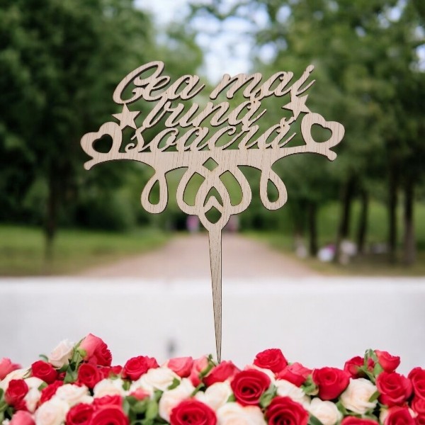 ### Descriere pentru Topper "Cea mai bună soacră" din Lemn Albasia by www.decoartburlui.ro Adăugați un touch de eleganță și personalizare tortului dvs. cu topper-ul "Cea mai bună soacră" din lemn Albasia de la DecoArt Burlui. Creat cu măiestrie din lemn natural de Albasia, acest topper nu este doar un simplu decor, ci un simbol al recunoștinței și aprecierii pentru cea mai bună soacră. #### Caracteristici principale: - **Material Premium:** Topper din lemn Albasia, cunoscut pentru durabilitatea și frumusețea sa naturală. - **Design Elegant:** Creat cu atenție la detalii pentru un aspect sofisticat și rafinat. - **Personalizare Unică:** Posibilitatea de personalizare îl face un accesoriu de tort deosebit, perfect pentru a evidenția relația specială cu soacra dvs. - **Eco-Friendly:** Fabricat din materiale sustenabile, acest topper este prietenos cu mediul. - **Versatilitate:** Ideal pentru diverse ocazii, fie că este vorba de aniversări, nunți sau evenimente speciale. #### Utilizări Recomandate: - **Accesorii Tort:** Adaugă un element decorativ unic și elegant tortului, făcându-l centrul atenției la orice eveniment. - **Cadou pentru Soacră:** Un mod deosebit de a arăta aprecierea și dragostea față de soacră, acest topper fiind un cadou special și personalizat. - **Evenimente Festive:** Potrivit pentru aniversări, nunți și alte sărbători, aducând un plus de farmec și eleganță decorului. #### De ce să alegeți DecoArt Burlui? La DecoArt Burlui, ne mândrim cu arta noastră de a crea produse de calitate superioară. Topper-ul nostru "Cea mai bună soacră" nu face excepție, fiind realizat cu măiestrie și pasiune pentru detalii. Alegeți acest topper festiv pentru a aduce un zâmbet pe fața soacrei dvs. și pentru a transforma orice tort într-o capodoperă. Comandați acum acest topper handmade și bucurați-vă de un decor tort de neuitat, disponibil pe [www.decoartburlui.ro](http://www.decoartburlui.ro).