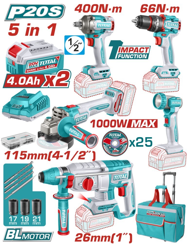 TOTAL - SET 5 UNELTE - 20V - CU 2 ACUMULATORI 4.0Ah SI INCARCATOR (INDUSTRIAL) PowerTool TopQuality