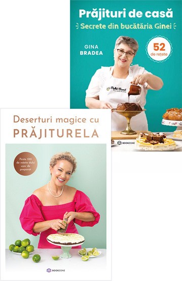 Deserturi magice cu PRĂJITURELA Amesteci, cerni, topești, mixezi, guști, coci, decorezi. Bucătăria ți-e plină de praf de stele, de mirosuri și gusturi care te trimit pe tărâmuri dulci. În bucătăria ta, totul este posibil, pentru că tu crezi în magie. În magia deserturilor.Aceasta este și superputerea Prăjiturelei, care îți deschide ușile către o lume magică, împărtășind cu tine peste 100 de rețete încântătoare – de la torturi, prăjituri și tarte, până la clătite, brioșe și deserturi la pahar. Tarta ei celebră cu lime, pe care o poți pregăti în doar 10 minute, îți va aduce înapoi amintirea zilelor însorite de vară, când răcoarea fructelor era binevenită. Prăjitura Greta Garbo îți va trezi nostalgia Crăciunului de altădată, când zăpada se așternea în straturi, exact ca cele ale acestui desert clasic, ce combină gustul bogat al nucilor cu gemul de caise. Tarta cu ciocolată și fructe de pădure, biscotti cu fistic și petale de trandafir, cornulețele fragede și câte și mai câte deserturi așteaptă să fie savurate și împărtășite cu cei dragi, pentru că nu sunt doar rețete. Sunt povești de suflet, gata să transforme orice masă într-un prilej de bucurie. Simți? Miroase a magie. Prăjiturela și-a scos telul fermecat și a adunat într-un singur loc rețete care te fac să spui ‘wow’ fără să ridici o baghetă magică. Această carte te va ghida pas cu pas prin deserturi delicioase, create cu pricepere și un strop de magie. Ce e special aici este varietatea gusturilor, dar și felul în care Prăji îți transferă din superputerile ei: e simplu, o să iasă delicios! - Cătălina Penciu, autor newsletter culinar Eat/Cook/Travel O carte care s-a lăsat așteptată, dar asta o va face cu atât mai râvnită. Ea s-a născut dintr-o pasiune pe care am descoperit-o cu mulți ani în urmă și este rezultatul celei mai constante evoluții profesionale pe care am urmărit-o în această piață în ultimii 15 ani! Greu de egalat! - Marius Tudosiei, fondator Băcănia Veche Prajituri de casa Mai simple sau mai elaborate, așezate pe platouri și prezentate cu drag, prăjiturile de casă sunt mândria oricărei gospodine. De aceea, am adunat în această carte cele mai îndrăgite reţete de prăjituri din România.Să vă fie de folos, să gătiți cu mare drag aceste prăjituri, aşa cum vi le ofer şi eu. Nu uitați ingredientele secrete: presărați dragoste din belșug și adăugați 2-3 zâmbete. - Gina BradeaBunătăți pe toate gusturile! Descoperă rețete pentru checuri cu cacao și cu fructe, plăcinte de tot felul, ciocolată de casă, rulade, prăjituri cu foi așa cum pregăteau mamele și bunicile noastre.Doamna Gina, așa cum îi spun gospodinele și gurmanzii care îi urmăresc de ani și ani blogul plin ochi de rețete, a pus în aceste cărți toate secretele deslușite cu trudă în aburul dens al cratițelor fierbinți și al plăcintelor proaspăt ieșite din cuptor. Astfel, toți cititorii vor găsi ceva pe gustul lor, de la începătorii într-ale bucătăriei, la cei mai rafinați chefi. Într-o epocă în care lumea pare că se îndepărtează de tradiții, de tot ceea ce am moștenit bun și frumos de la străbunii noștri, Gina Bradea încearcă să transmită generațiilor noi lucruri frumoase și valoroase pe care ar fi mare păcat să le pierdem. Și nu mă refer doar la rețete culinare, ci la autenticitate, la bunătate, respect și dragoste de oameni. Gina nu este doar o gospodină pasionată așa cum ni le amintim cu drag pe bunicile și pe mamele noastre, ci este și un om minunat, un exemplu frumos care are multe de transmis. - Irina Binder, scriitoar