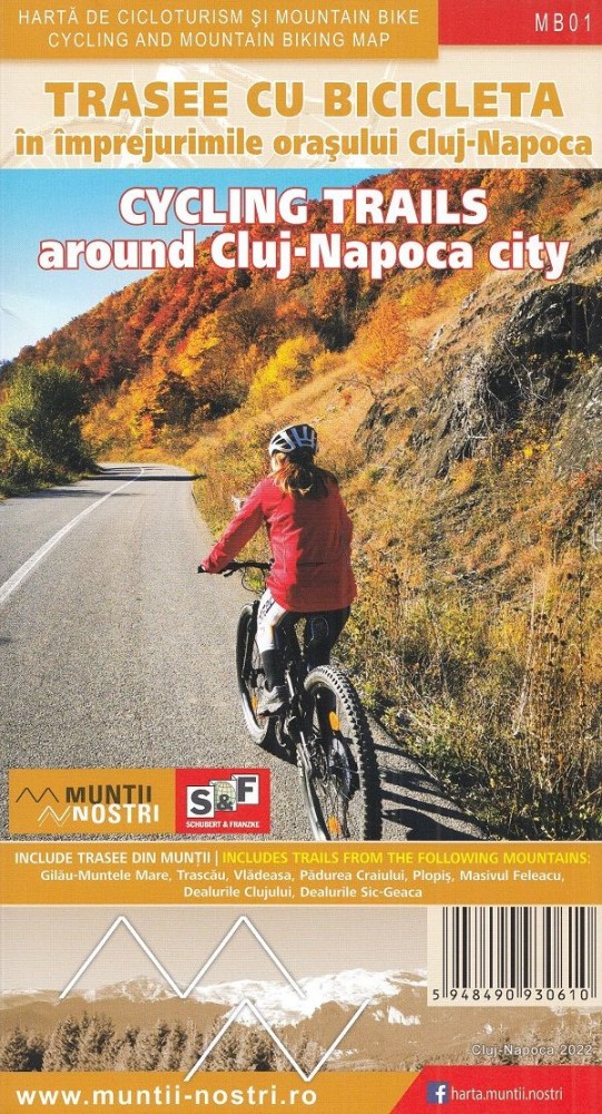 Trasee cu bicicleta in imprejurimile orasului Cluj-Napoca. Harta de cicloturism si mountain bike. Muntii nostri / Cycling trails around Cluj-Napoca city. Cycling and mountain biking map\r\n\r\nEditie bilingva romana-engleza.\r\nAceasta colectie de harti realizata de editura Schubert & Franzke este o incercare indrazneata de a reuni sub o singura coperta trasee de bicicleta dintr-un areal mare situat in imediata apropiere a municipiului Cluj-Napoca sau in zonele montane sau de deal unde clujenii (in general) practica activitati turistice, precum drumetii, cicloturism, sporturi de iarna, pescuit sau agrement sub diferite forme (camping, paddling, SUP, sporturi nautice, plimbari cu barca etc).\r\nTraseele de bicicleta au fost parcurse intre anii 2021-2022, in colaborare cu membri ai Clubului Sportiv Clujul Pedaleaza. Acest material este una dintre cele de acest gen din colectia Muntii Nostri, in format cu planse volante,\r\nEste in fapt o actualizare de data recenta a primei harti cicloturistice din colectie -MB01-, publicata in 2010, intitulata \"100 excursii cu bicicleta in zona Clujului\". Datorita extinderii constructiilor, modificarii terenurilor imprejmuite sau alterarii drumurilor forestiere propuse in acel numar, am dat curs acestei harti care propune trasee cu informatii de actualitate.\r\nArealul turistic din apropierea Clujului, denumit generic \"imprejurimile Clujului\" se intinde defapt pe teritoriile administrative ale judetelor Cluj, Alba si Bihor si constau in locatii cu o veche traditie ca poli turistici pentru locuitorii municipiului Cluj-Napoca si nu numai.\r\nHarta de cicloturism Trasee cu Bicicleta in imprejurimile orasului Cluj-Napoca poarta indicativul MB01, ceea ce inseamna ca este primul numar din seria \"Harti Cicloturistice\".\r\nHarta s-a editat folosind cele mai actuale tehnici de cartografiere si s-a tiparit pe hartie rezistenta la umiditate. Este usor de citit si simplu de utilizat datorita stilurilor de reprezentare cartografice, specifice firmei Schubert & Franzke si datorita structurarii practice ale informatiilor. Totul este la indemana, exact acolo unde este necesar, fiind utila pasionatilor de cicloturism.\r\n\r\nToate traseele au fost parcurse pe teren cu GPS-ul. Acestea sunt descrise in detaliu in limbile romana si engleza, unele trasee avand atasate imagini reprezentative. Fiecare traseu are o caseta tehnica continand: ruta traseului verificat pe teren, profilul cu punctele de reper mai importante, date referitoare la dificultate, lungime, urcus total, coborare totala etc. Harta contine si un caroiaj UTM, un sistem de coordonate metric, fiind util in masurarea rapida a distantelor pe harta. Umbrirea si curbele de nivel scot in evidenta relieful, usurand orientarea.\r\nSa va bucurati de aceasta harta, sus pe culmile insorite ale Muntilor.