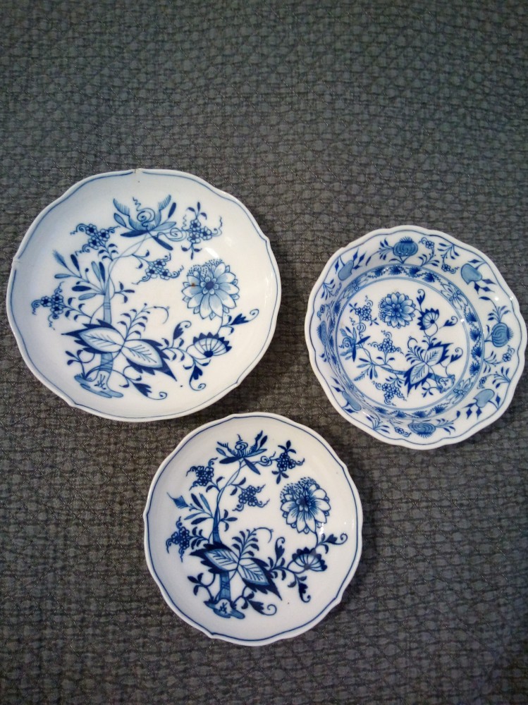 Trei farfurioare portelan Meissen cu marcaj din gama -BLUE ONION- , diferite marimi, folosite vechi.