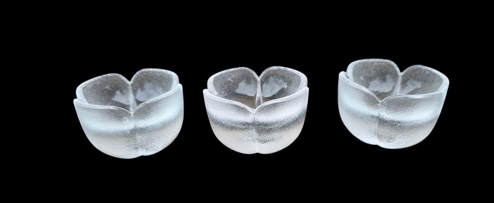 Trei suporturi pentru lumânări de dimensiuni mici din sticlă presată, transparentă, cu suprafață ușor texturată tip gheață și formă florală stilizată cu patru petale.