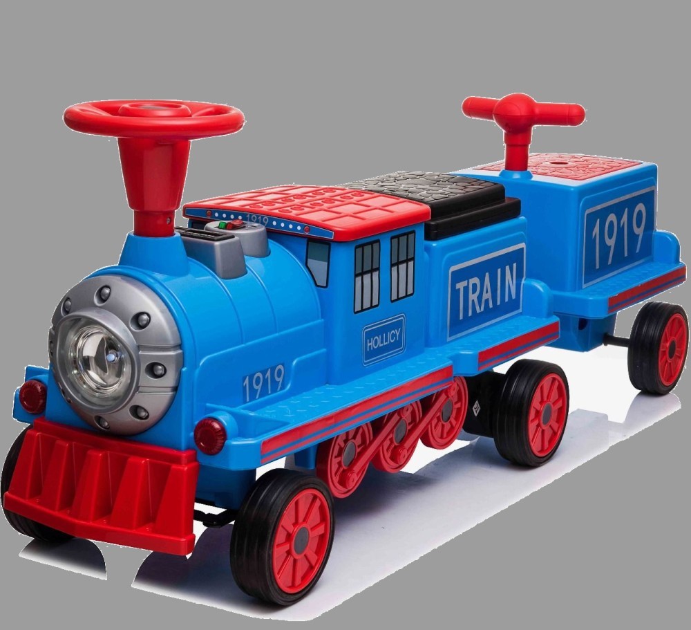 Trenulet electric albastru SX1919 cu extra vagon, baterie 12V, putere 180W, cu music player si 3 locuri pentru 3 copii.