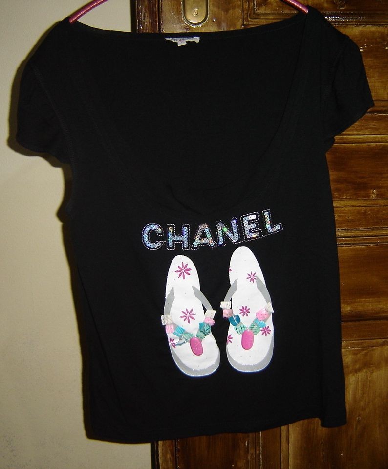 Tricou dama CHANEL original in ultimele poze se poate vedea codul tricoului , model deosebit , stare impecabila ca nou marime L dimensiuni: latime umeri 40 cm , latime bust 40 cm , lungime totala tricou 50cm