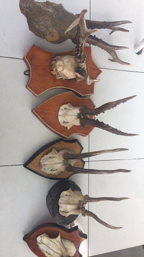 Sant 6 trofeie pe panoplii, cu coarne de caprior.