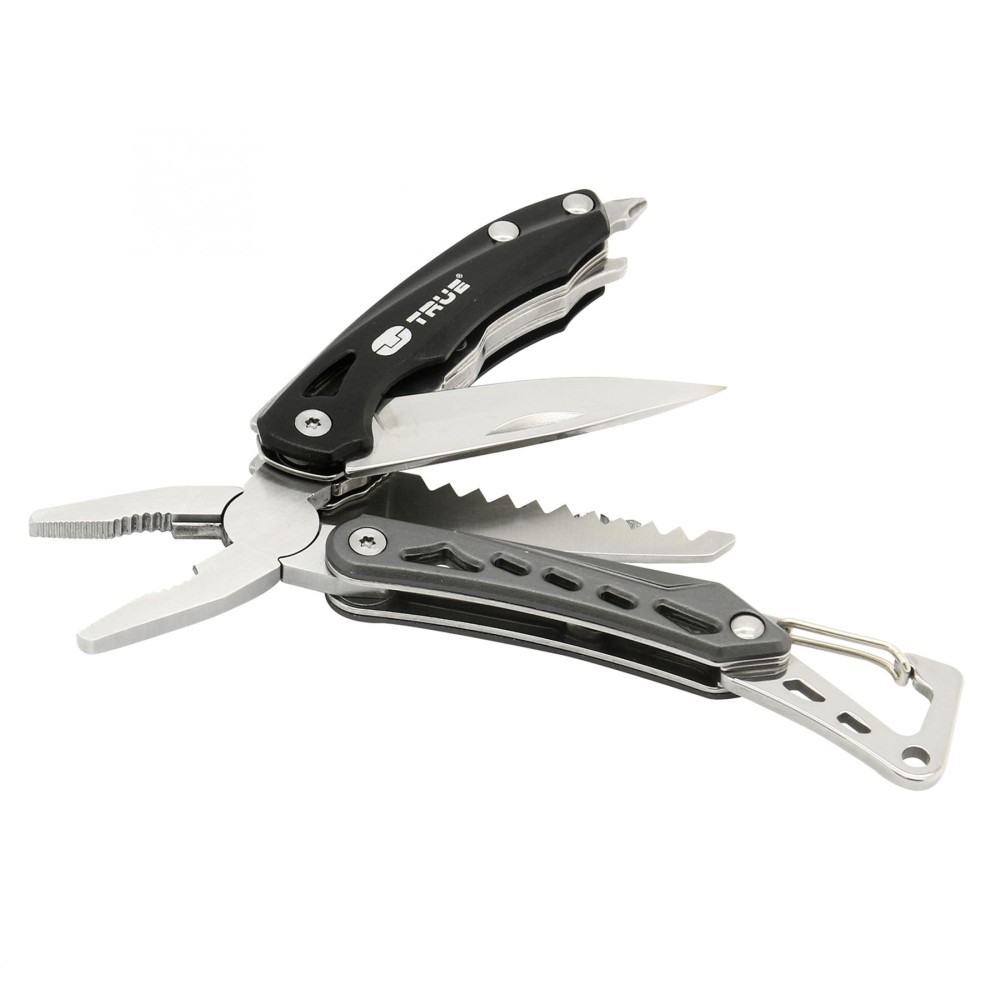 TRUE UTILITY SEVEN TU180K 9 in 1 otel inoxidabil. • instrument multifuncțional de calitate superioară, super compact • unealtă de bază 9 în 1 • clește cu arc, din oțel inoxidabil, clește de tăiat sârmă, șurubelniță cu cap stea, desfăcător de sticle, cuțit, ferăstrău, șurubelniță cu cap plat, carabină, pilă • cadru din oțel inoxidabil • mâner ergonomic din aluminiu eloxat • carabină cu atașare rapidă • dimensiuni (pliată): 8,5 x 3 x 1,5 cm.