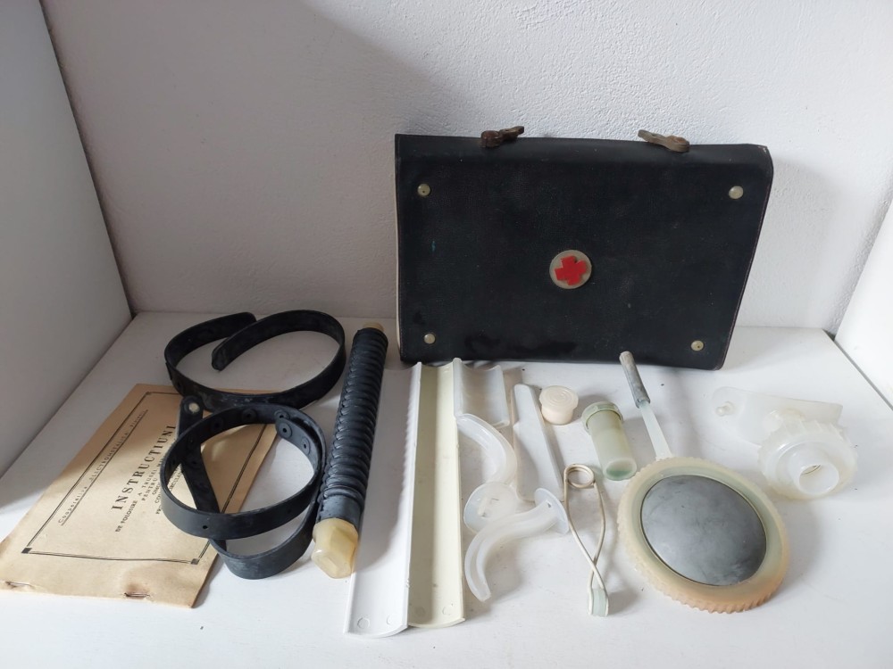 Include cutia originală de plastic si husa de vinilin negru, cu emblemă a Crucii Roșii, însoțită de instrucțiuni tipărite în limba română: