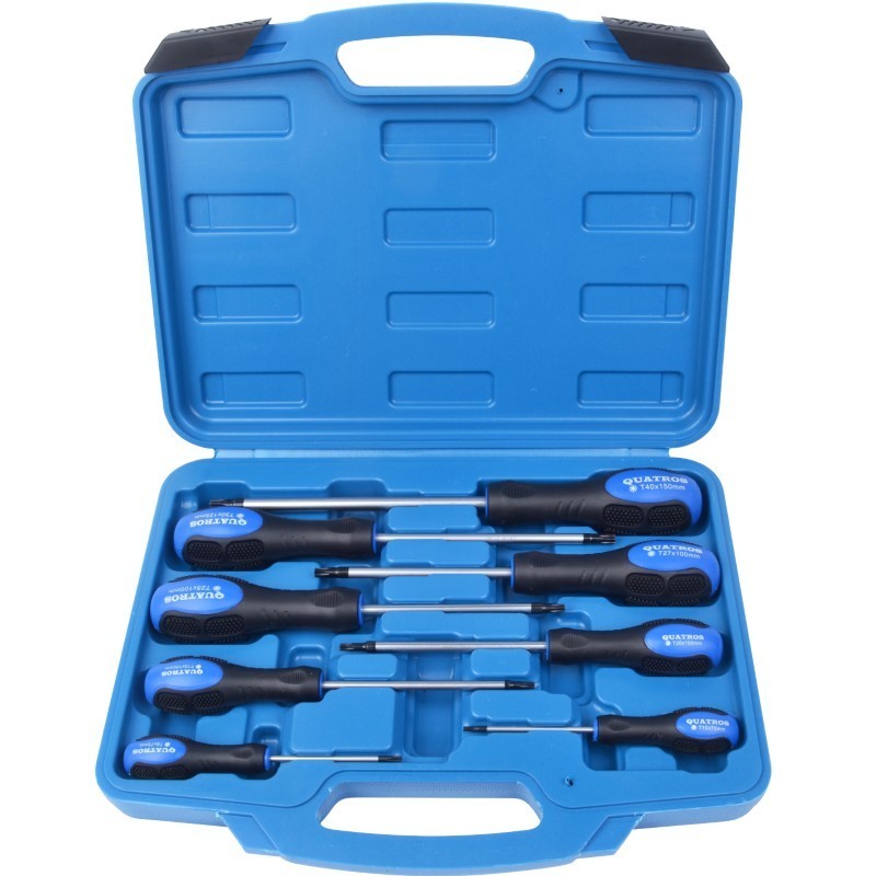 Trusa cu șurubelnițe torx, T8-T40, de la Quatros este un set profesional destinat lucrărilor de precizie în mecanică, electronică și reparații auto. Având un profil stelat cu 6 laturi, aceste șurubelnițe asigură o prindere fermă și o transmisie eficientă a forței, reducând riscul de deteriorare a șuruburilor.