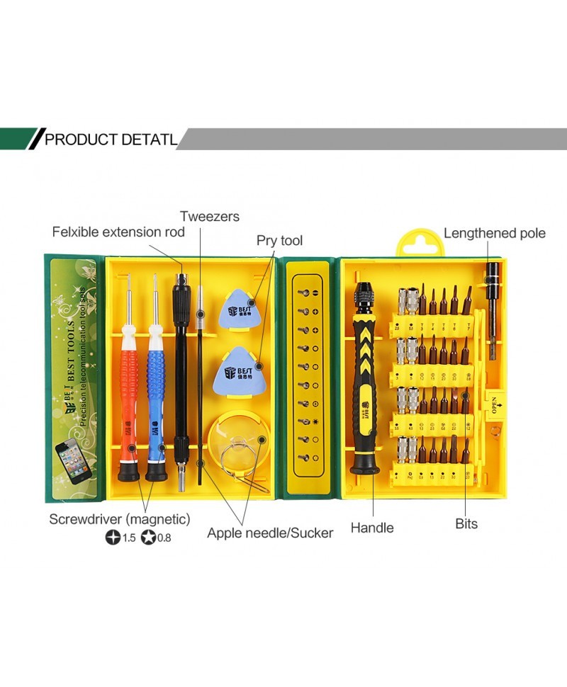 Trusa Surubelnite BST-8922, 38 PieseTrusa Surubelnite BST-8922, 38 Piese Brand Name: BEST Model Number: 8922 Type:Precision Screwdriver Set Screw Head Type: Torx,Philllips,Pentalobe,Slotted,Hex Size: 150mm*105mm*36mm Material: S2 steel+ pvc Packing: 38pcs in 1 Package: plastic box Package Size:: 150mm*105mm*36mm Package weight:0.47kg/box Universal
