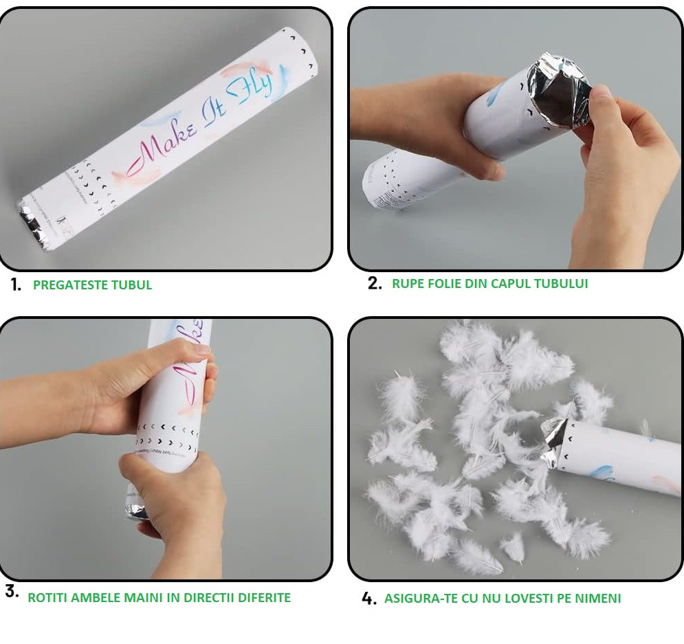 - Ușor de utilizat, confetti-ul este eliberat prin rotirea sau acționarea mecanismului tubului.