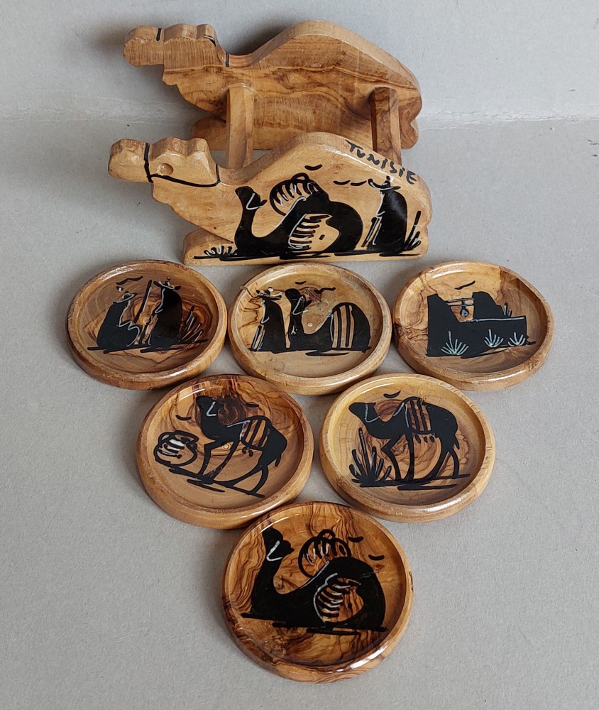 Tunisia, Set 6 suporturi cesti cafea din lemn pictat manual camila, vintage 1970