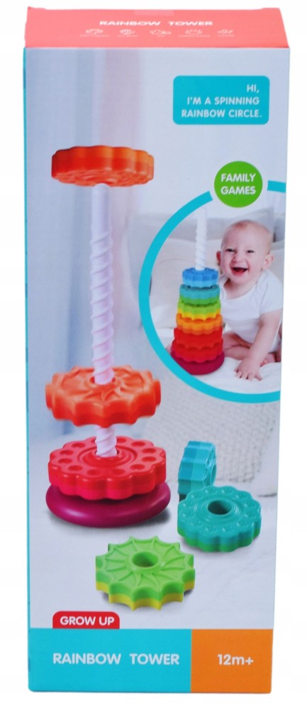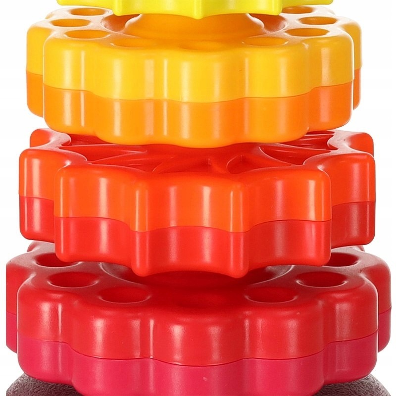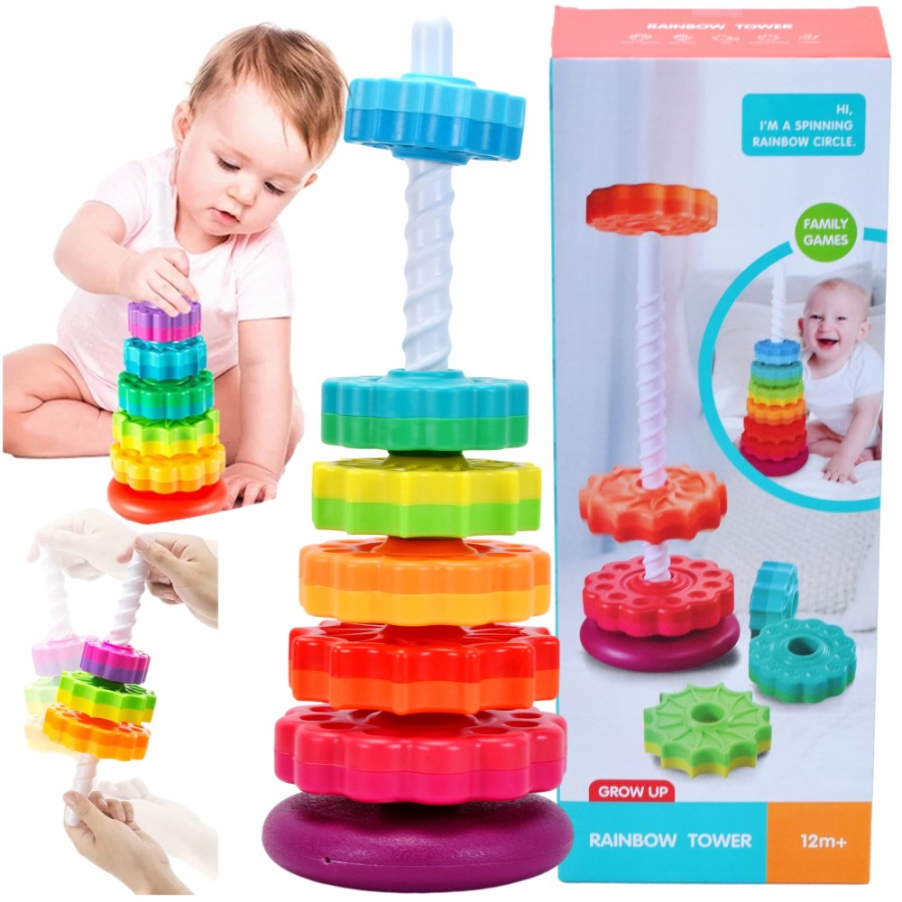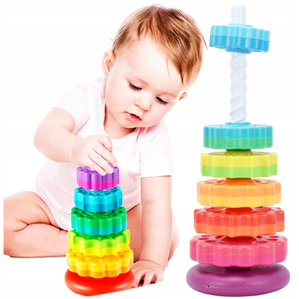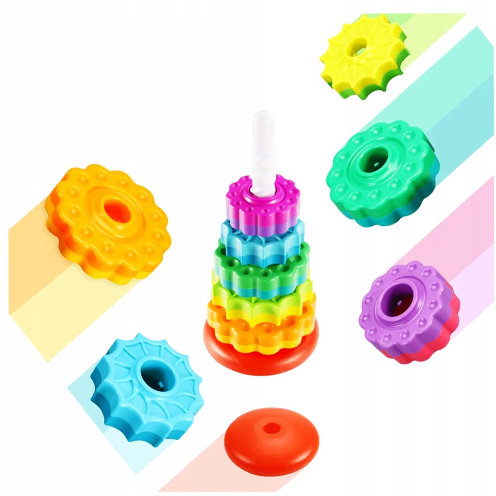 ✅ Turnul colorat este format din șase cercuri de diferite culori, cu diverse sculpturi. Sarcina copilului este să așeze toate cercurile pe o tijă de plastic, care are și ea o textură interesantă!
