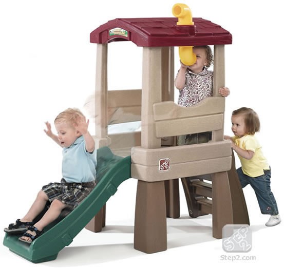 Turnulet Cu Tobogan Culori Inchise Dimensiuni: 146 1 x 63 5 x 169 cm. Are trepte late usor de urcat de catre copiii mai mici. Prezinta un tobogan micut si o platforma de 8 8 cm. Periscopul din acoperis permite o vizualizare de 180 grade a imprejurimilor. Produsul rezista foarte bine in timp. Este necesara asamblarea de catre un adult. Varsta: 1 an si jumatate - 5 ani