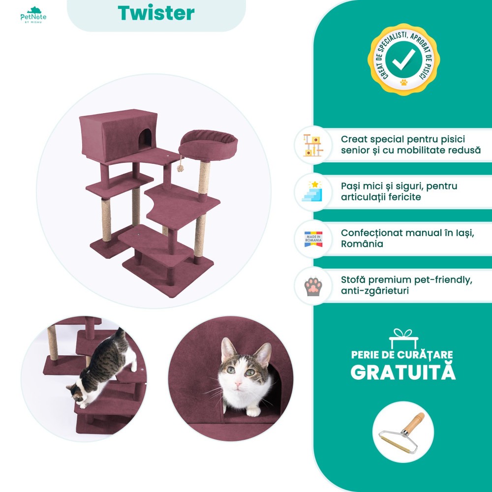 Numele "TWISTER" descrie versatilitatea acestui ansamblu de joacă, care poate fi ușor răsucit pentru a fi așezat în două moduri diferite, adaptându-se la spațiul disponibil din casă. Cu o înălțime de 105 cm, acest model este proiectat pentru accesibilitate și siguranță, oferind pisicilor senior și celor cu mobilitate redusă o experiență de joacă plină de aventură și confort.