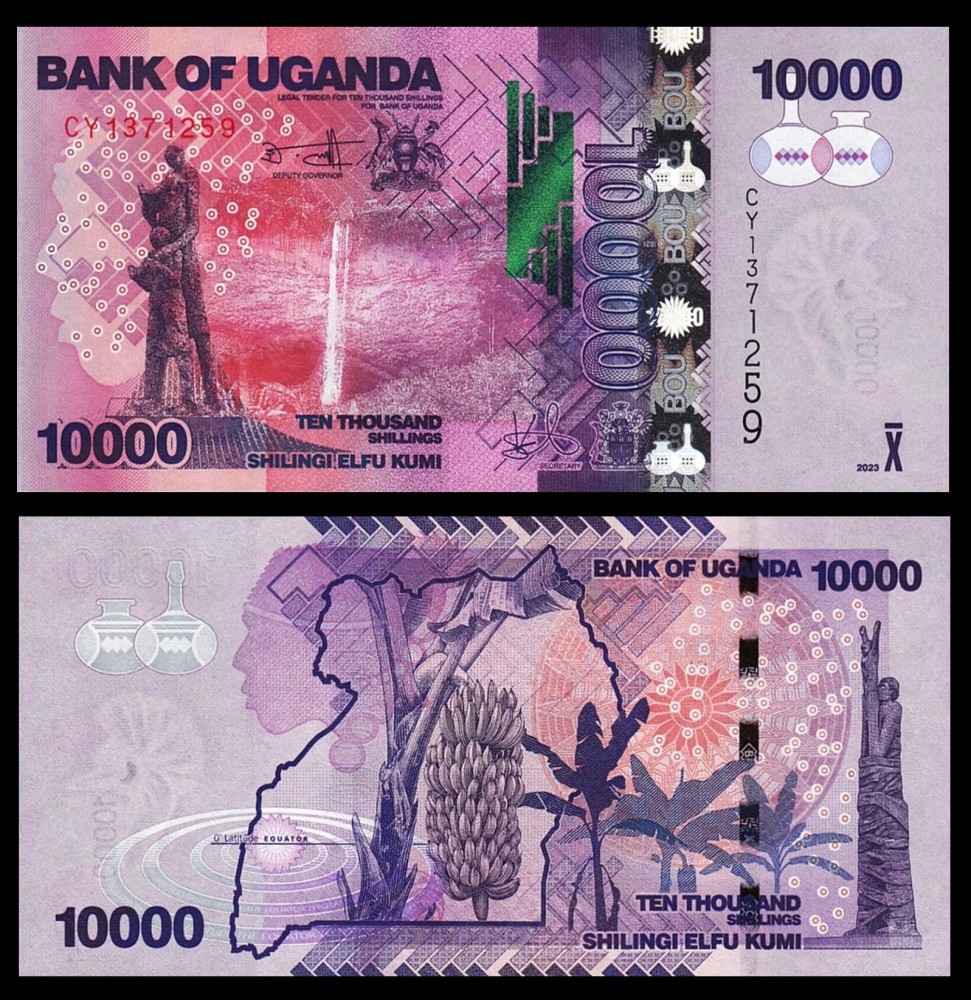 Splendida bancnota de 10000 Shillings din Uganda 2023 (P-52) în stare necirculatã (UNC).