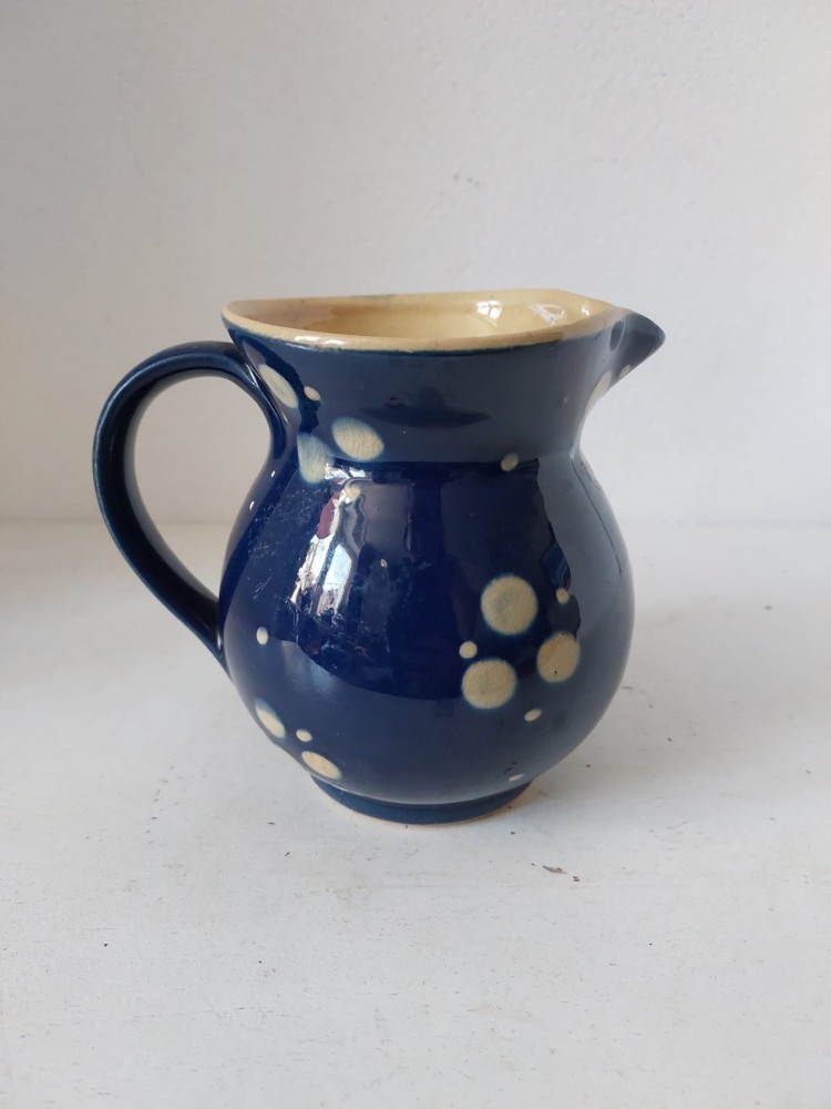 Ulcica ceramica / cana cu cioc si toarta, taraneasca, rustic, albastru cu galben, 12cm inaltime