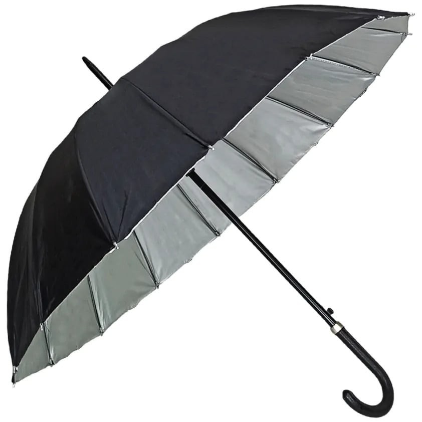 Materialul textil impermeabil cu strat dublu – negru la exterior și argintiu la interior – respinge eficient apa și oferă o protecție suplimentară împotriva soarelui. Mânerul curbat, ergonomic, permite o prindere confortabilă și sigură. Sistemul automat de deschidere facilitează utilizarea rapidă cu o singură mână.