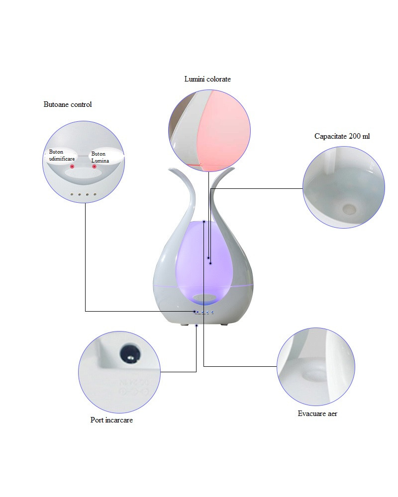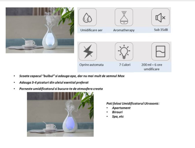 Luminile super-cool LED se pot dubla ca o lampa de noapte uimitoare, astfel incat va puteti bucura de un somn de noapte relaxant, in timp ce functia de oprire automata va va ajuta sa va culcati fara griji. In plus, rezervorul de apa de 200 ml va va ajuta sa economisiti timp si efort, deoarece nu trebuie sa il umpleti la fiecare doua ore. (8-10 ore de functionare).