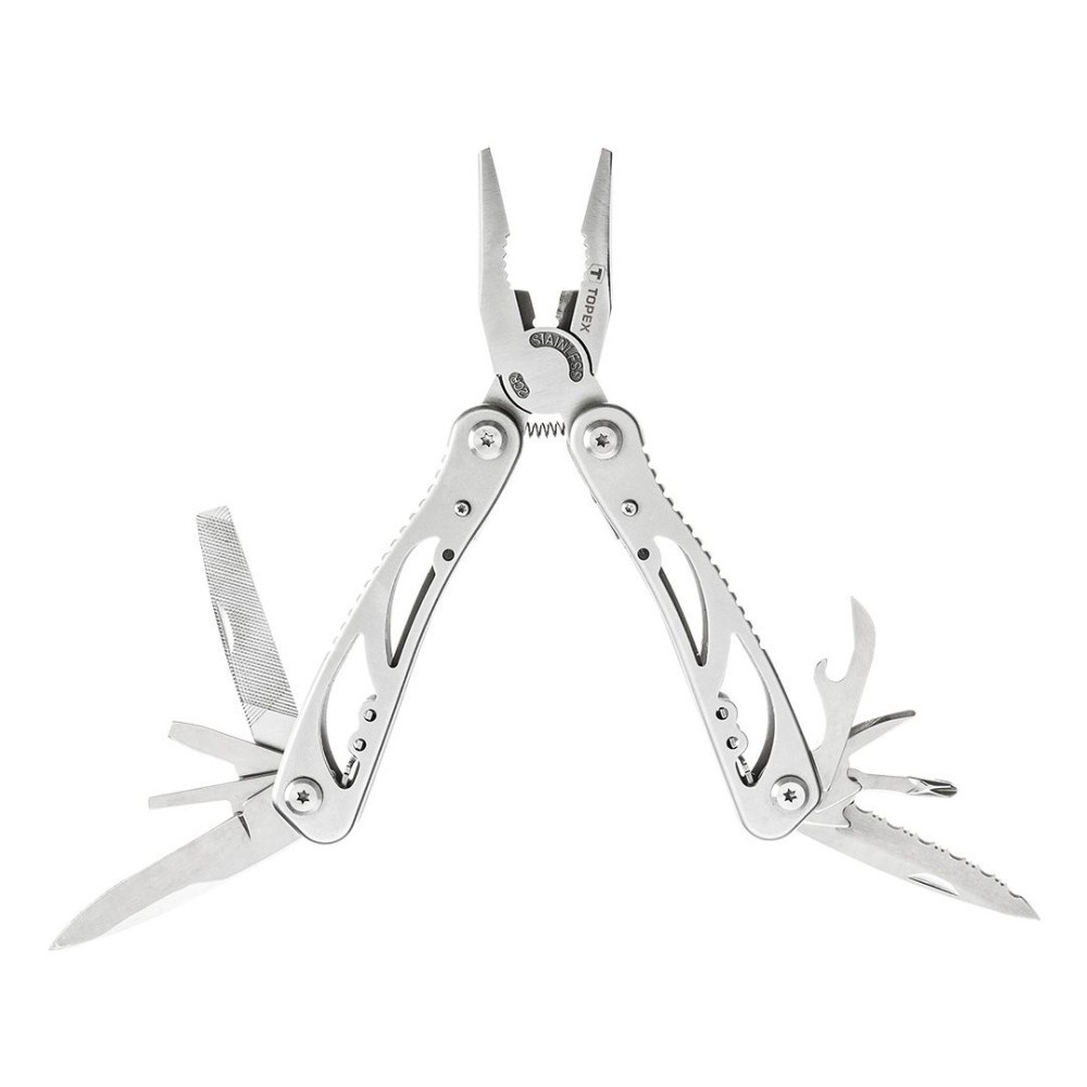 Instrument multifuncțional TOPEX cu lungimea de 165 mm. Corpul din aluminiu eloxat îmbunătățește durabilitatea și rezistența la coroziune. Într-un instrument se găsesc foarte multe funcții diferite, inclusiv cele mai populare șurubelnițe PH, lame de cuțit necesare în multe situații, plus în campinguri ca deschizător de conserve și sticle.
