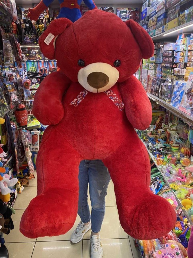 Urs urias rosu din plus cu inaltimea de 1,2m. Materialul exterior este plus catifelat foarte pufos si placut la atingere iar in interior este umplut cu puf siliconat antialergic.