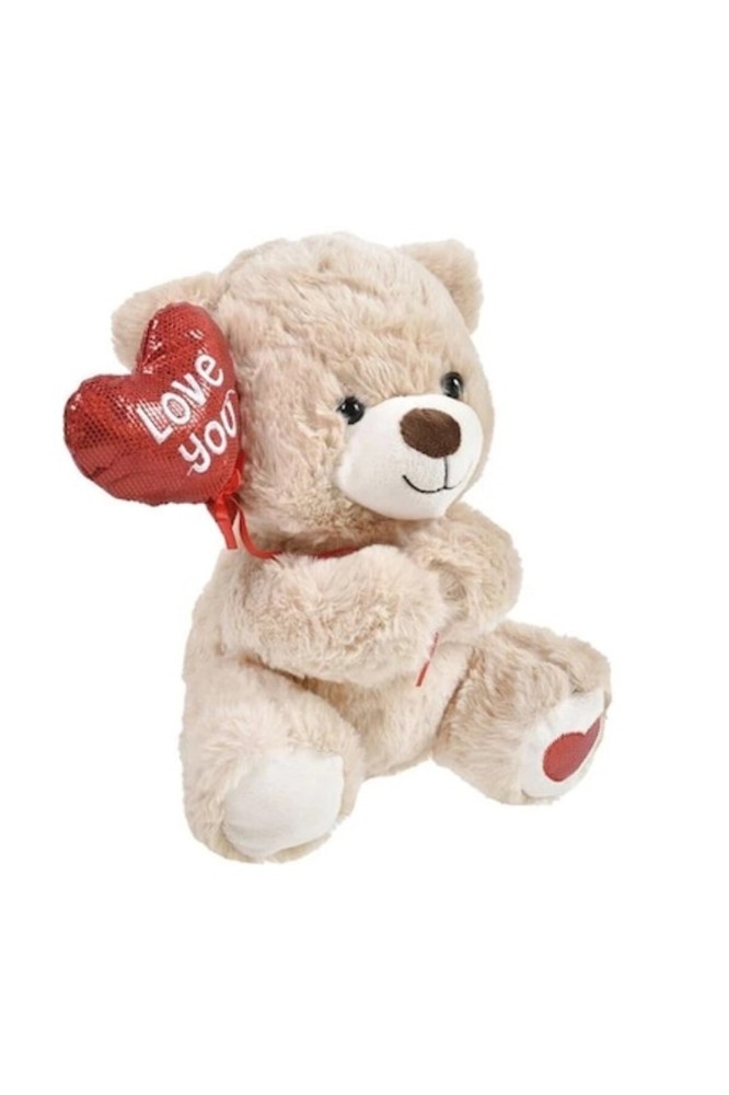 Un ursuleț de pluș bej așezat, cu o inimă roșie pe labă, o inimă balon din folie roșie și o broderie albă pe care scrie „Te iubesc”.