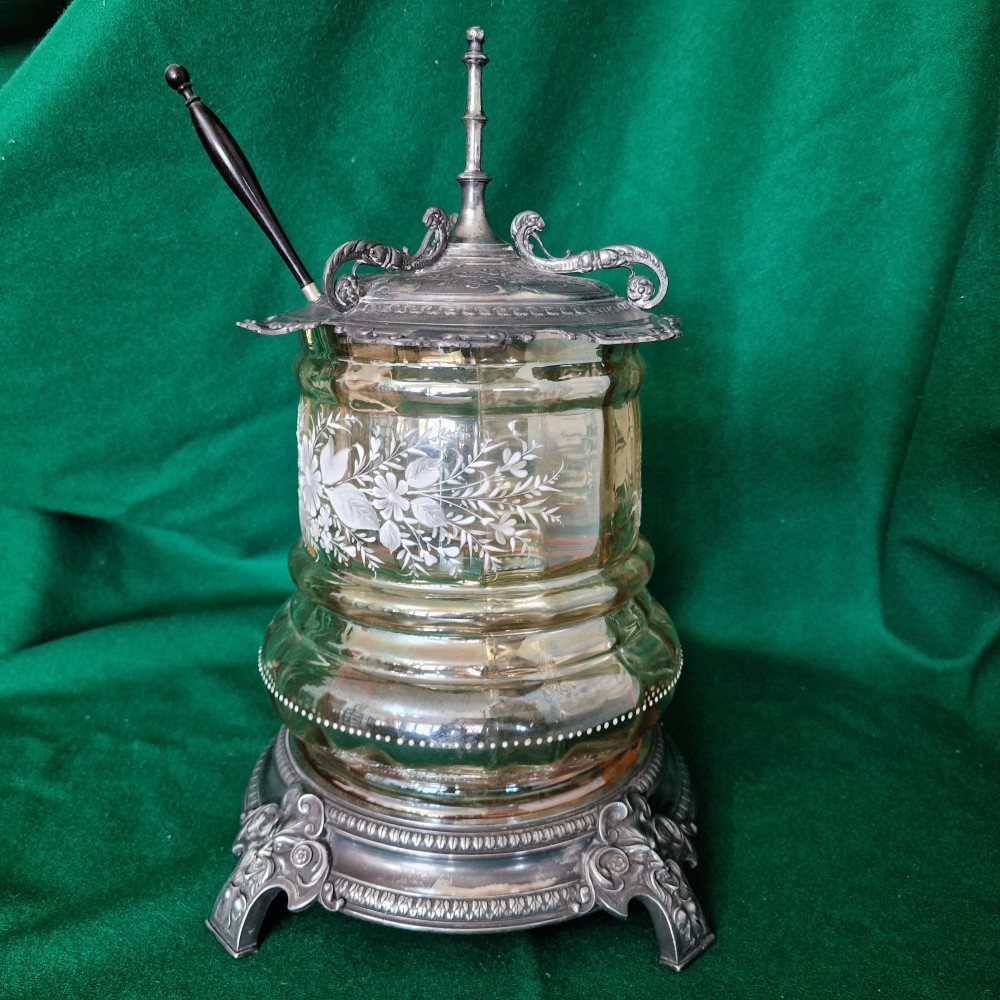 Vas pt. compot, bol pt. punch sau sangria din metal argintat si sticla pictata manual cu email - FRANTA anii 1880, stare perfecta, dim: 37/27 cm