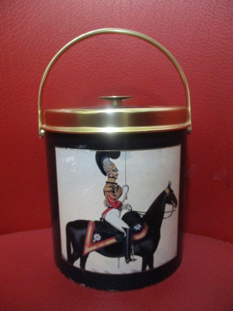Vas termoizolant, metal + furnir lacuit, recipient cu toarta si capac, decorat cu imaginea unui calaret din garda regala, marcat pe capac " Made in England", diametrul 11,5 cm, inaltime - 13 cm, cu toarta - 19 cm, stare buna, uzura timpului