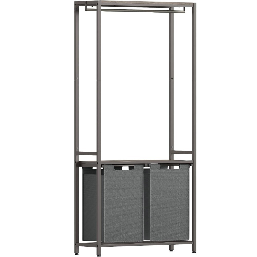 VASAGLE Cos de rufe, 2 compartimente, saci de rufe detasabili, 2 rafturi, tija umerase, 2x46L, 73x33x177cm, gri