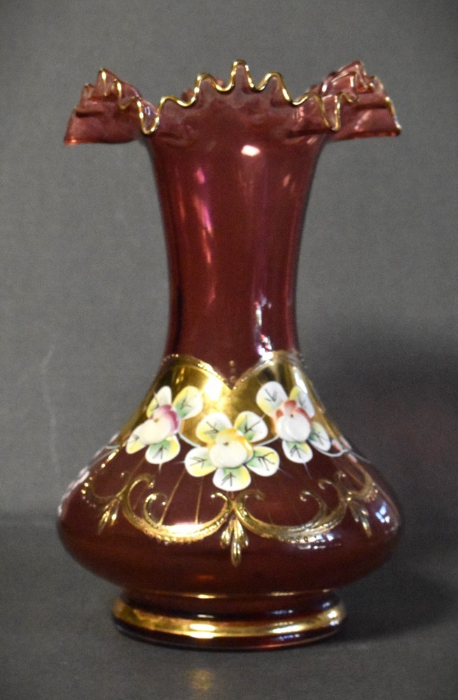 Vaza cristal Boemia / Bohemia rosu rubin - pictata manual cu aur si email.