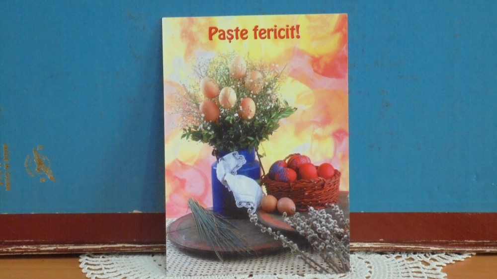 VAZA CU FLORI SI OUA ROSII - TIP FELICITARE DE PASTI - SCRISA.