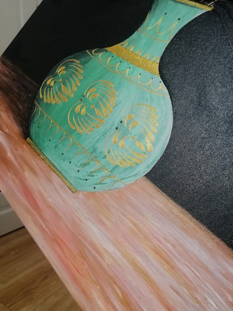 Tablou pictat în culori acrilice metalizate cu pene de păun aplicate. Mărimea pânzei 60x80x2 cm