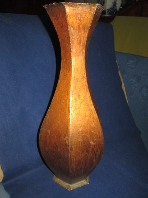 Vaza din arama veche cu forma hexagonala manual executata, marimi: inaltime-35cm, diametrul central 15cm, marime buza-9cm, baza_8cm, in stare generala buna, in patina.