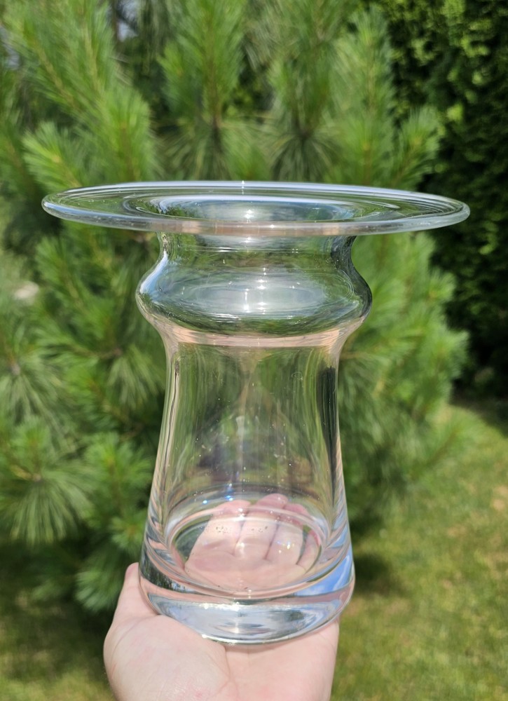 Vază din sticlă transparentă, bază cilindrică solidă care se îngustează spre mijloc, apoi se lărgește spre partea superioară, terminându-se cu o deschidere largă și plată. Prezintă mici urme de uzura (ultimele 3 foto)
