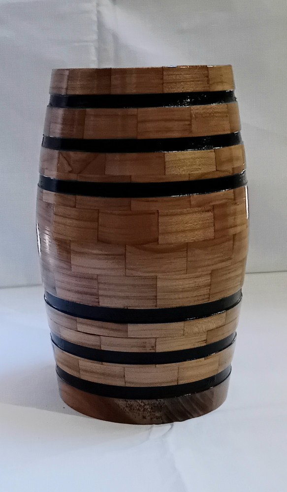 Vaza rustica tip butoi din lemn de cires cu peretele gros de aproximativ 2 cm.